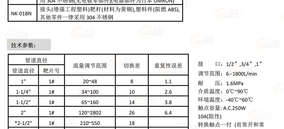 NK-01B系列流量開關采用靶式傳感器,可用于水冷卻系統或潤滑油路系統作為流量控制器或報警保護作用。也可用于檢測,觀察液體流量的繼動器,一般用于空氣調節,供水設備方面的用途,用于感應流經管道的液體流量變化,如水,乙烯,乙二醇或其它非危害性液體,其典型應用在需要有連鎖作用或“斷流”保護的場所。設定值為可調,用戶可根據需要自行調整。