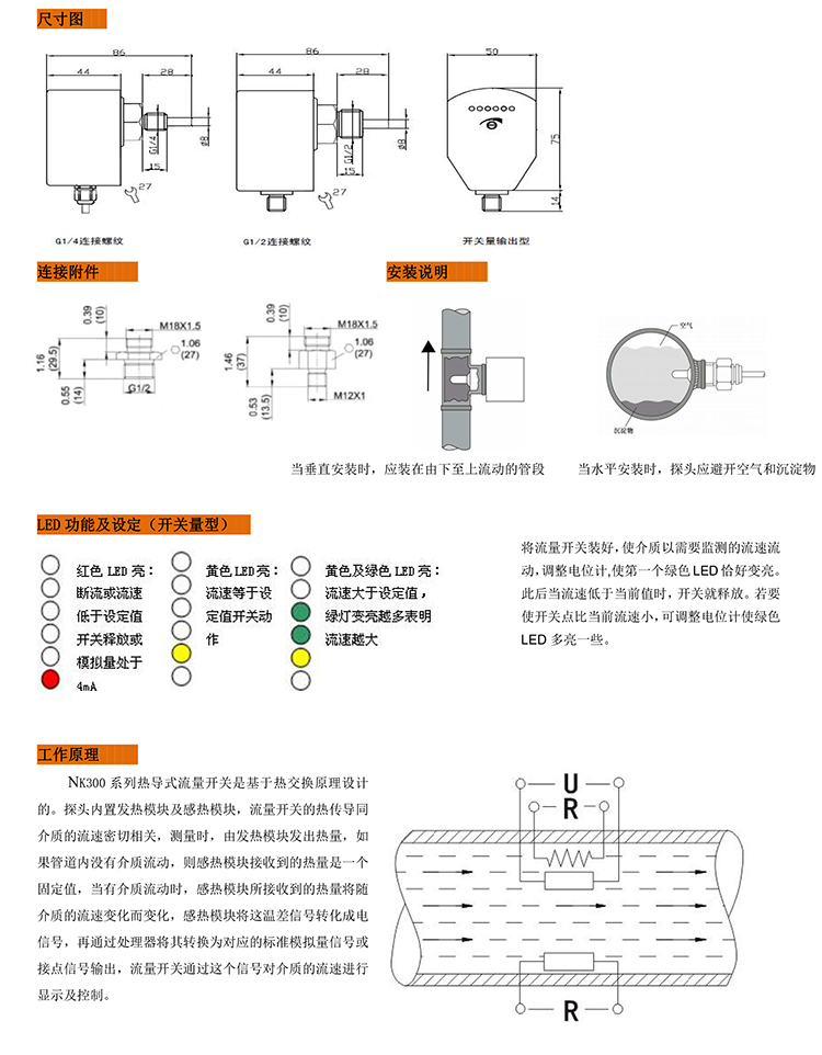 NK300系列熱導式流量開關可對管道中的液體流動情況進行實時監控,無活動部件,免維護,安裝方便,一種型號是用于多種管徑要求,提供開關量輸出,并采用6個LED實時顯示流體流速狀態,實現下列監控功能:介質流動,降低/提高流蘧:介質存在/不存在;介質流動/靜止;監控管道內流體流速大小、斷流監測或防止系的空轉。被廣泛應用于石油化工電力、治金、廠紙、食口品加工、水處理、電池廠等行業。氣液兩用型,可用于氣動和液壓系統,可用于循環水,切割液及潤滑油的斷流監測。以及泵的空轉保護。