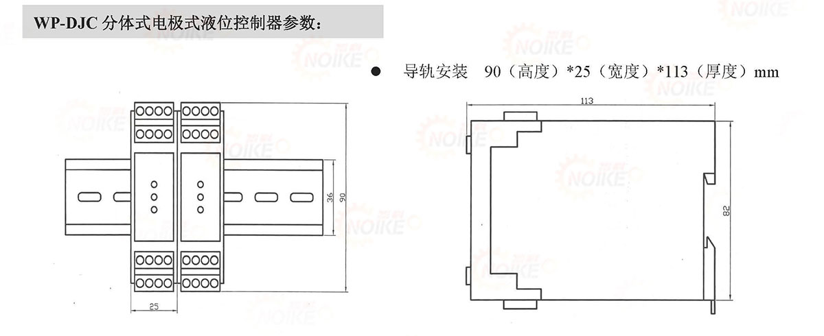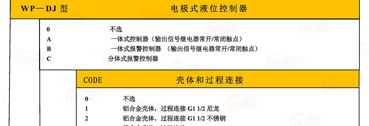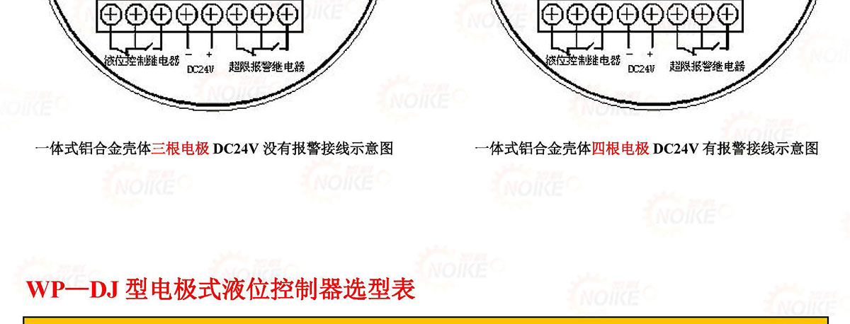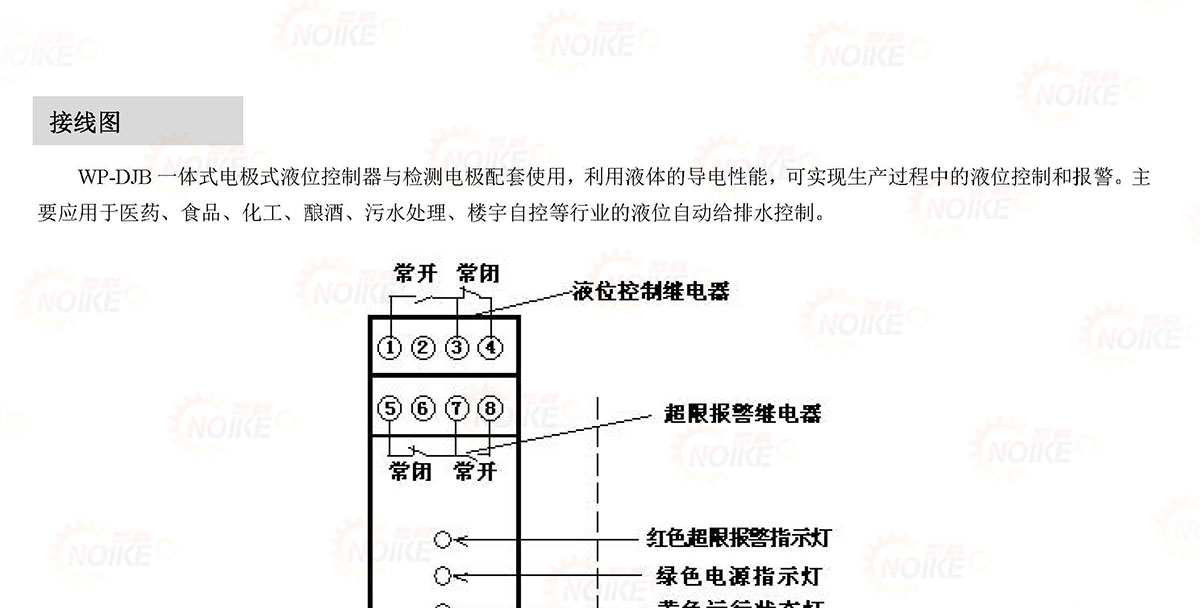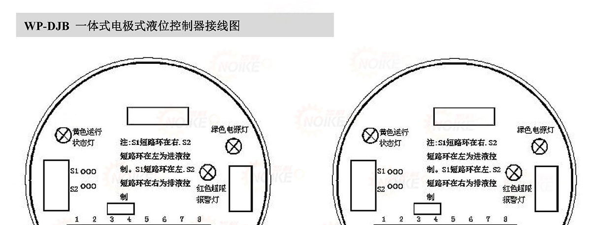WP-DJ型電極液位控制器由液位檢測電極和控制器兩部分組成,它與機泵結合可以實現水池或罐體進液、排液控制WP-DJ型電極液位控制器分一體型和分體型兩種安裝形式。一體型電極液位控制器是將控制器的電路板裝入液位檢測電極的接線盒內,組成一體結構;分體型是控制器與檢測電極分開安裝,控制器精巧緊湊,有控制箱內軌道安裝和控制盤面板安裝兩種形式。針對不同的使用環(huán)境,液位檢測電極又可分為塑料殼體和鋁合金防爆殼體,與設備連接有尼龍連接件和不銹鋼連接件兩種,可根據實際工況選擇。