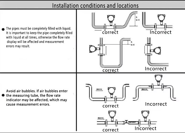 The sensor installed horizontally of the turbine flowmeter requires that the pipeline should have no observable tilt (within 5 deg;). The vertical deviation of the sensor installed vertically should be less than 5 deg;, and the fluid direction should be downward and upward.