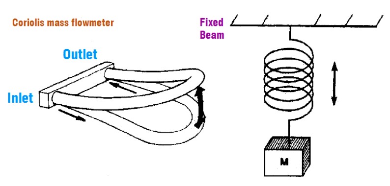 科里奧利質量流量計也能夠給出流動流體的密度,其工作原理與彈簧和質量組件的原理相同,如下圖所示。