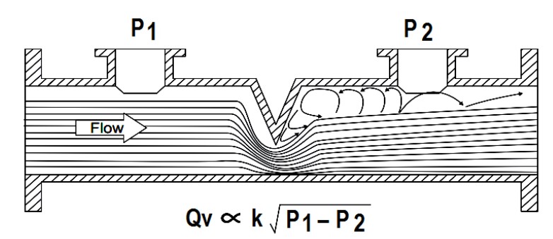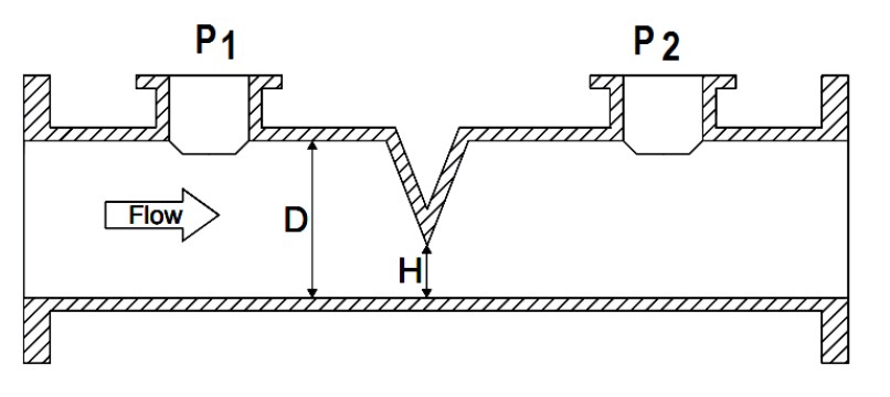該測量儀器的功能原理基于伯努利原理(連續性和能量平衡方程)。使用楔形物,產生差壓,其可以等于質量或體積流速。流量范圍通過H / D比確定。