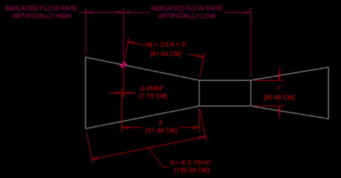 因此,我們將Parshall的部分放置在必須進行測量的位置,但是該部分中唯一的真實測量點在哪里?為此,我們轉向Parshall博士及其對水槽的開發。 Parshall博士確定流量應在從喉嚨向后測量的會聚壁長度的2/3處測量。重要的是要注意,這個距離不只是從喉嚨到背部的距離的2/3,而是側壁長度的2/3。
