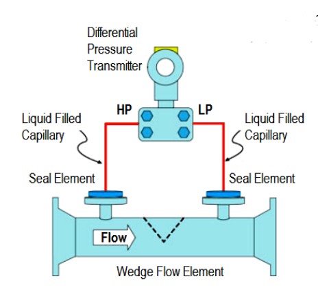 在楔子的前面(高壓或動(dòng)態(tài)壓力側(cè))和楔子的后面(靜態(tài)或低壓側(cè))測(cè)量壓力。通過(guò)確定這兩個(gè)測(cè)量值之間的差(稱(chēng)為壓差),可以計(jì)算出流體的體積流量,因?yàn)闇y(cè)量點(diǎn)的所有其他特征都是恒定的。